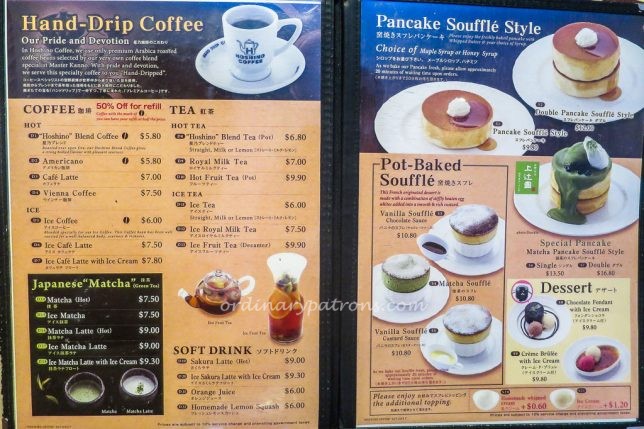 Hoshino Coffee’s menu has an eclectic range of items. There are omelets, savoury soufflés and pancakes as well as sandwiches, pastas and curry rice. They also have a brunch menu and have introduced new items from time to time.
