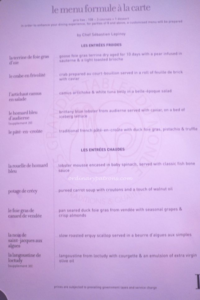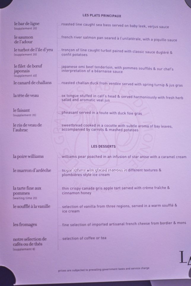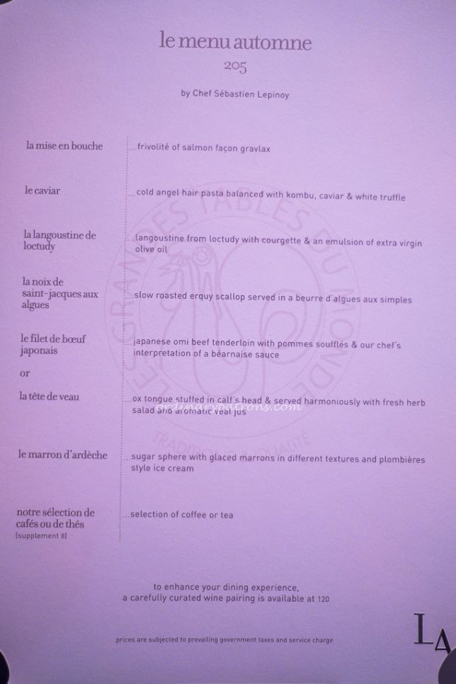 Another good reason to pick Les Amis as a restaurant for birthday celebration in Singapore is the format of their lunch menu. They have three lunch menus that cost $85, $108 and $205. They are quite reasonably priced considering the awards this restaurant have received (including a Michelin 2 star award), the quality of the accommodation and service. The menu that we had was the mid-range one – the $108 le menu formule à la carte. It is a four course lunch which is just about right for a lunchtime celebratory meal. We could choose what we like, rather than some pre-destined options decided by the host. Some items attract the payment of extra money.