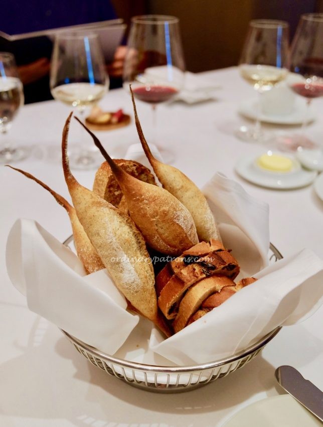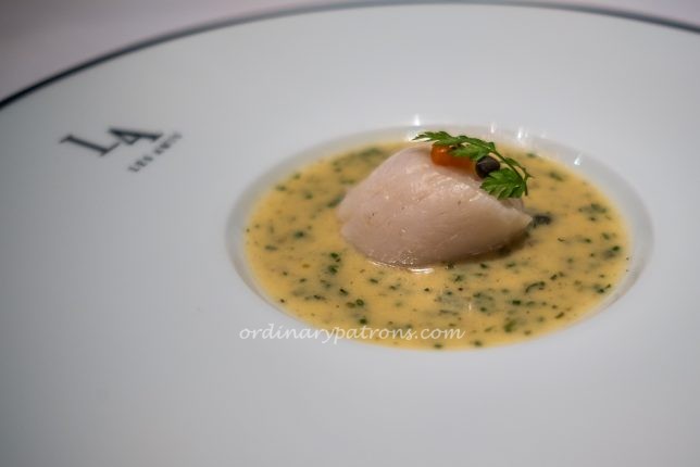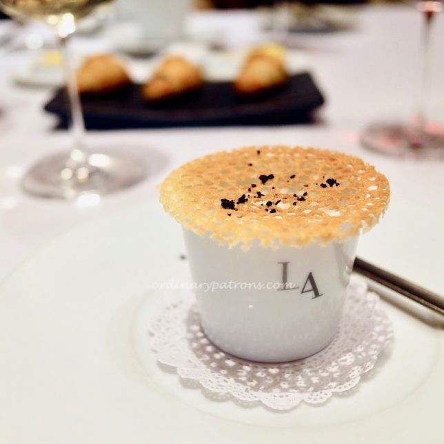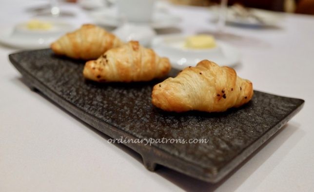 These were the amuse bouche served after the orders were taken. A canapé, some mini croissants with truffle flavour and a small cup of soup. Each was delightful and delicious.