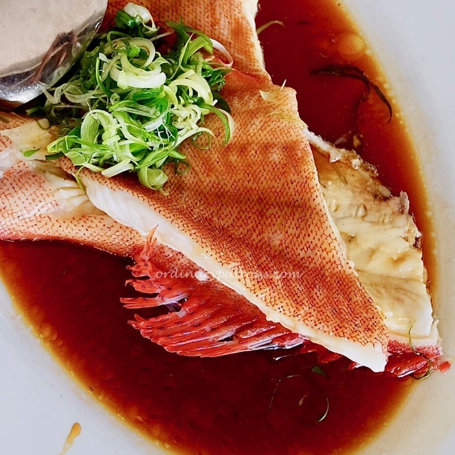 Fifteen minutes later, the red grouper (which some spell as garoupa) arrived, steamed in a soy sauce broth, Hong Kong style. It as only half of a tail, sliced down the middle, but it was more than adequate for two. The meat was thick and perfectly cooked. Â The contrast between the pure white meat and bright red skin was beautiful. This could be a National Day dish.