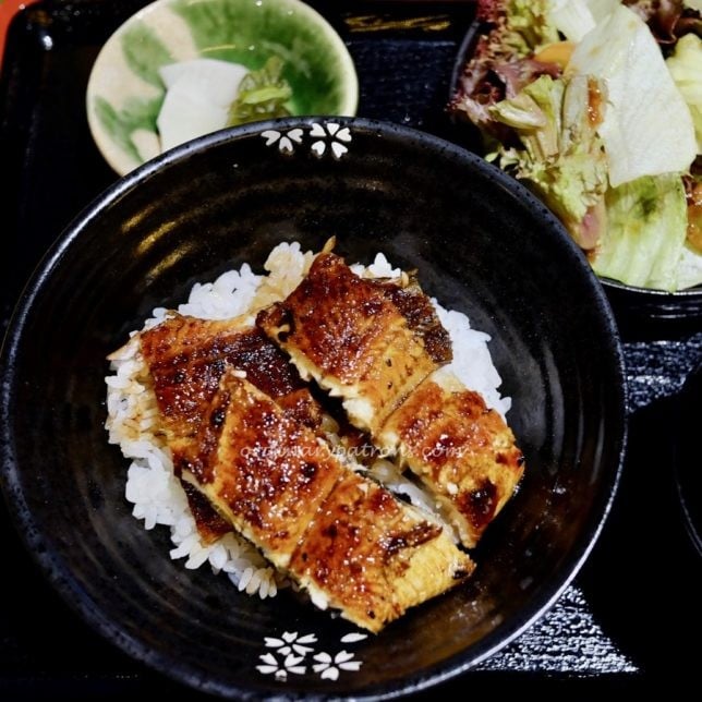 The Uya unagi is basically prepared in two forms – grilled with sauce or salt. The menu provides three options of ordering it. Eel a la carte is the most basic way – just select L/M/S portions and whether the eel is grilled with salt or sauce. The eel set menu options serve the eel with rice, salad soup and pickles. The Hitsumabushi style of serving eel is their signature way of serving eel and provides three or more ways to consume the unagi. We decided on a small unagi set ($25) and a large Hitsumabushi ($48). Tea costs $2 per person.