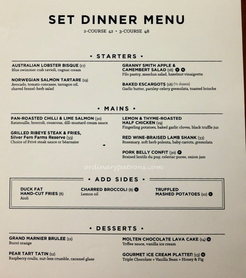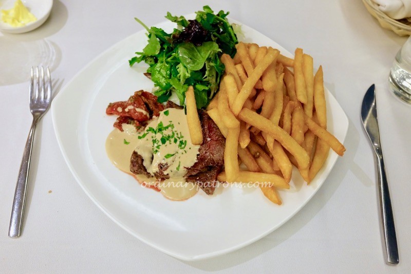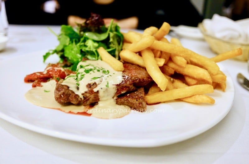 The ribeye steak ($33) arrived with the plate full. Most of the space was taken up by the large amounts of fries and a healthy portion of salad. The steak itself was quite small. But that was fine with us as it was adequate. We opted for the Prive steak sauce. The taste of the steak was decent but not exceptional.