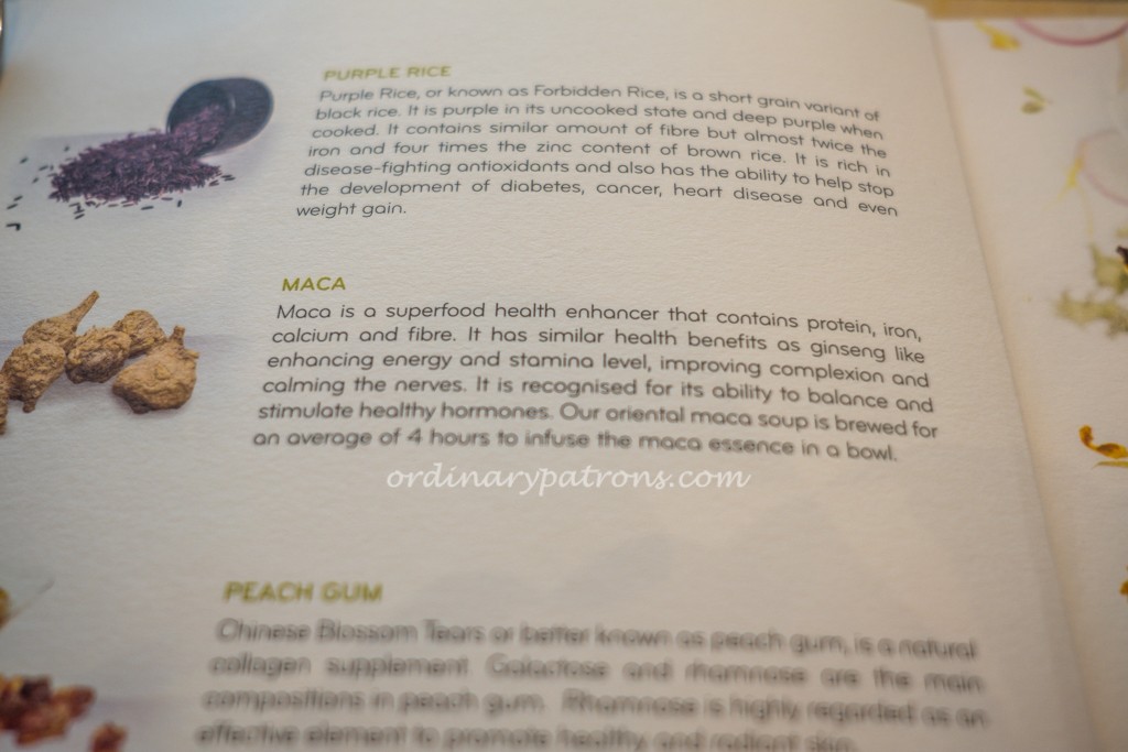 We decided to try the double boiled maca soup ($8.80 each) after reading the write-up in the menu. We are told that maca is a superfood health enhancer. Like ginseng, it enhances energy and stamina levels as well as other benefits. The maca soup turned out to be a dark coloured soup. It has an earthly and slightly herbal taste. I suppose the main reason to drink this maca soup is not the taste but the benefits.