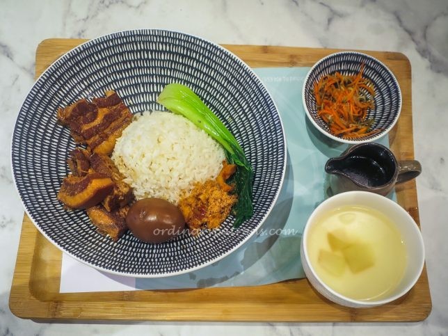 We went to Typhoon Cafe at Plaza Singapura for lunch on a weekend. We picked two items from the Typhoon Board Set Menu – 三杯鸡配鸡蛋面定食 Wok-fried San Bei Chicken with Sweet Basil served with egg noodles ($12.90) and 台式卤肉饭 Taiwan Lu Rou Fan pork belly stew & braised egg served with rice ($12.90). The sets came with a cold salad and a bowl of hot soup.
