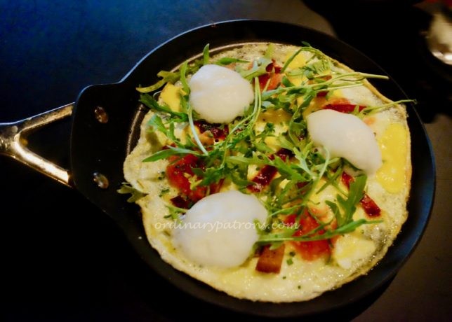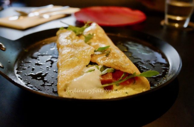 The above picture shows all the tapas together. The food was prepared very quickly. Â We should stagger our ordering in the future to avoid all the food arriving at the same time. The open tortilla with cheese foam ($14) was a nice omelette. It was first presented on a skillet and then folded up.
