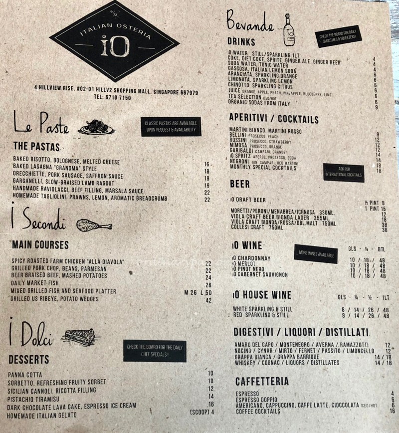 The iO Italian Osteria Menu is wide enough to make the nearby residents want to make multiple visits to this Upper Bukit Timah Italian restaurant.  The menu is printed on paper placemats, which is a good idea as everyone gets a menu the moment we sat down. Here are pictures of some portions of the menu.