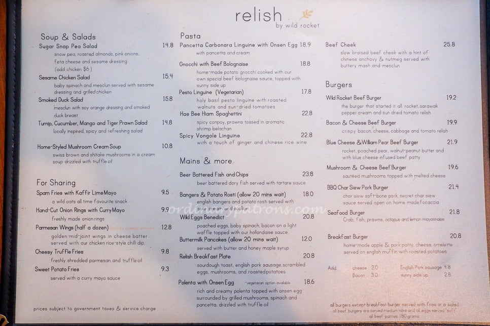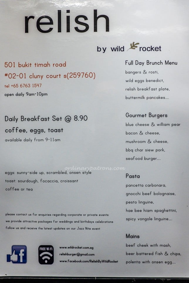 Relish @ Cluny Court by Wild Rocket is a place that comes to mind when we think of eating burgers.  According to the Wild Rocket website, they started to sell burgers at Relish in 2006 because there weren’t any places serving burgers using good quality ingredients.  Fortunately it is not a one trick pony and they serve up a number of other wonderful Western dishes as well. Cluny Court is a small shopping arcade at the corner of Bukit Timah Road and Cluny Road. The French Embassy is located right next door and the new section of Singapore Botanic Gardens is just across the street.
