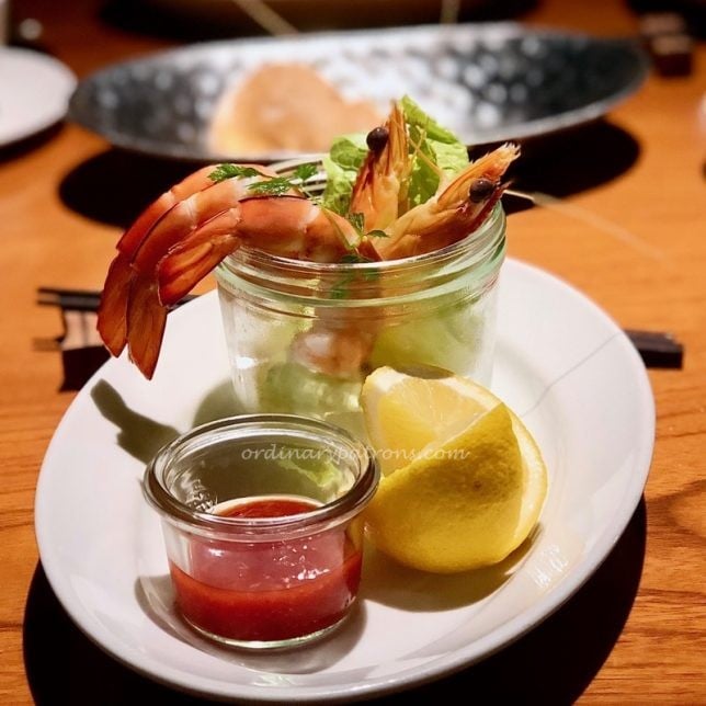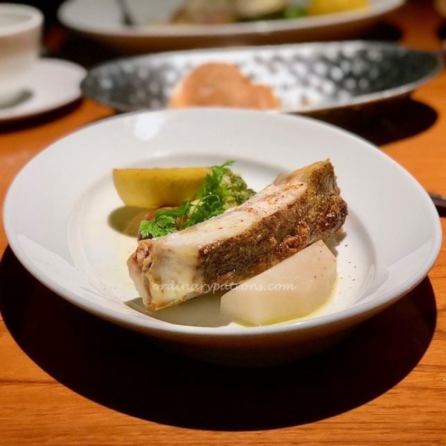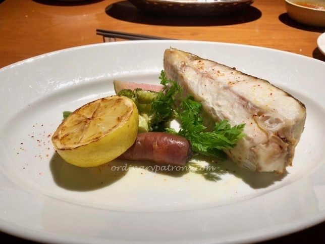 For the two-course lunch, we selected an all seafood lunch. Â King prawn cocktail as a starter (above picture) and the “sustainable market fish” (picture below) for the main course. Â The prawns were indeed large and had a good firm texture. As for the fish, I cannot remember what type of fish it was. Lightly grilled it was a meaty and clean tasting fish. Â Unless there are cholesterol concerns, this combination felt like a healthy set lunch.