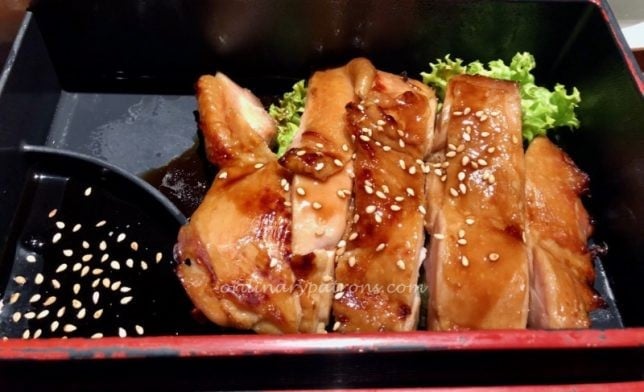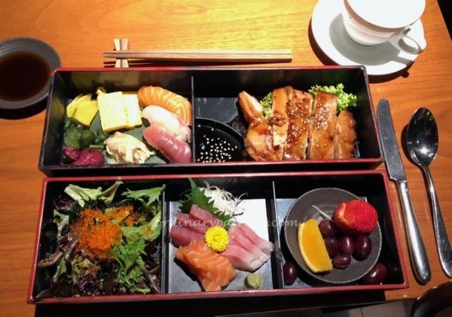 The other healthy set lunch option is the Japanese bento ($42).  The compartments in the box contained sashimi, sushi, salad, chicken and fruits.  Viewed as a whole, the portion was huge.   The vegetables tasted nice with the fish eggs. The teriyaki chicken was probably enough to be lunch itself. We could not finish it. Taste-wise, the items in the bento were not bad but not exceptional either.