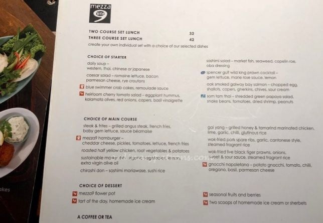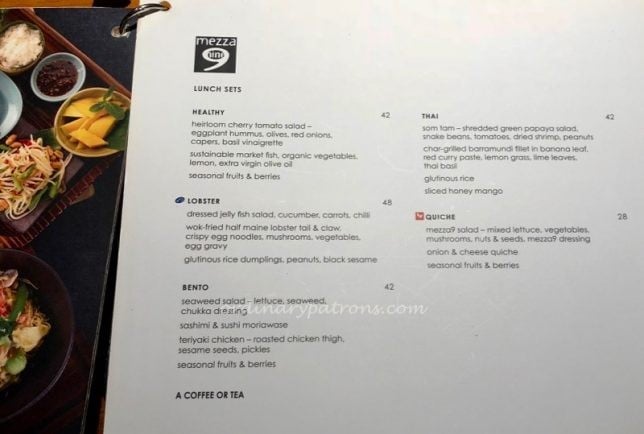 Here are pictures of the lunch menus at Mezza9. Â The normal set lunch costs $32 and $42 for two and three courses respectively. There are other more specific sets such as lobster ($48) and Japanese bento ($42). Â Coffee is served with each set lunch.
