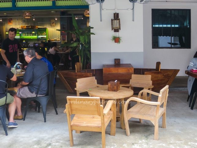 There is an outdoor section with an eclectic collection of wooden furniture including a cozy dining set in the shape of a boat. It looks like a chill-out spot for cocktails, beers, and bar food.