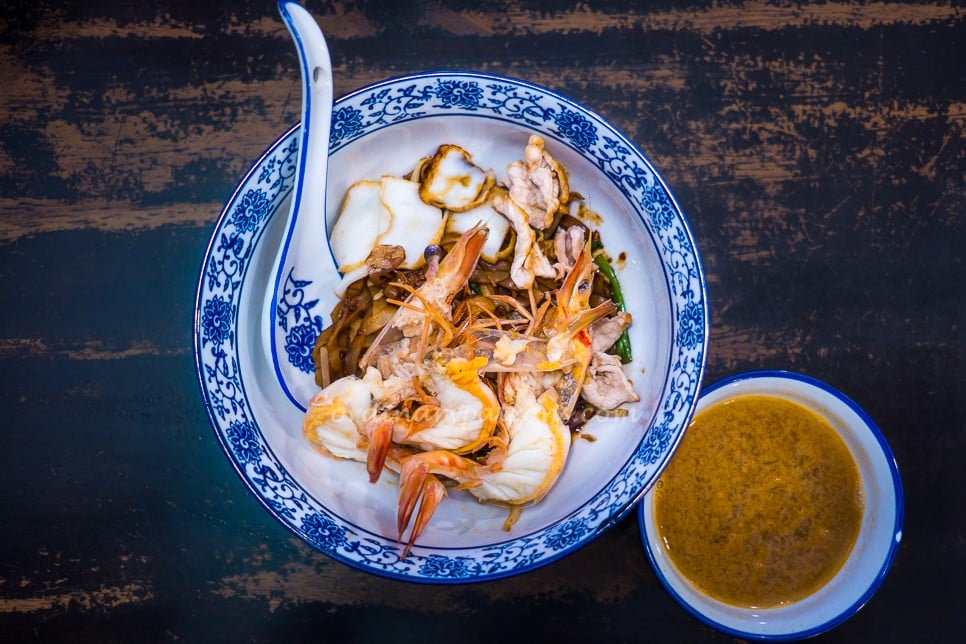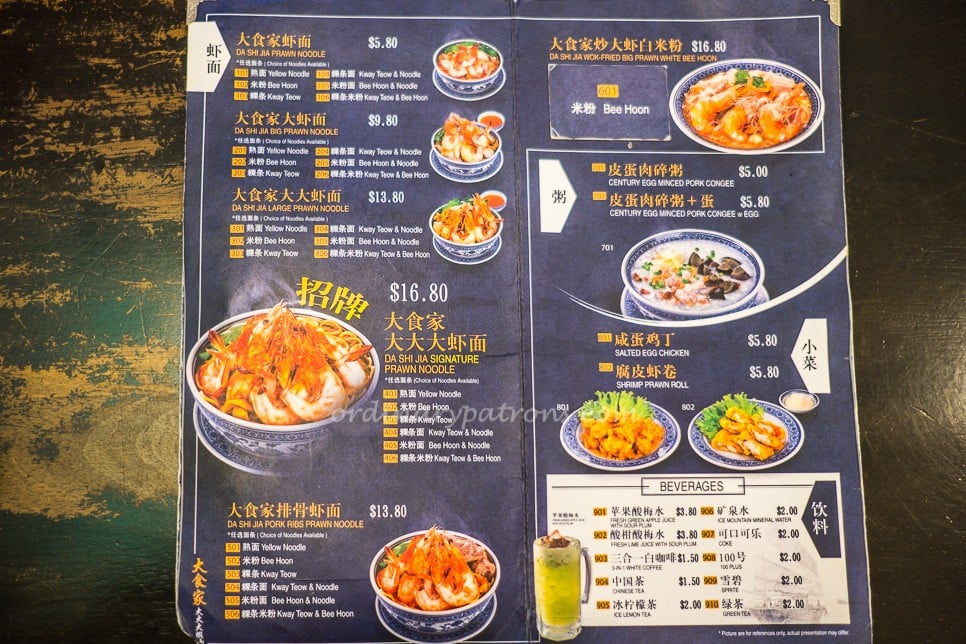 The Da Shi Jia Big Prawn Mee restaurant is neat and tidy and with a huge painting along the wall. Here is a picture of the menu. Apart from a few side dishes, there is only prawn noodles on the menu. The difference in prices simply reflect the differences in terms of the size of prawns used – prawn (虾面), big prawn (大虾面), large prawn (大大虾面) and signature prawn (大大大虾面). You can have the noodles in dry or soup form and select the type of noodles. The only real variant that is not like the others is the wok-fried big prawn white bee hoon.