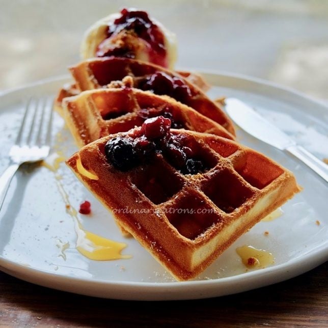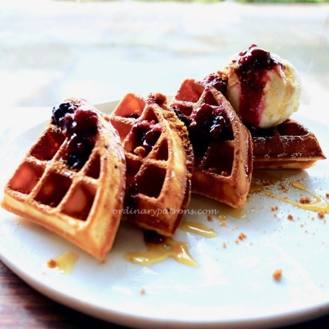 We chose theย Mixed Berries Compote Waffles ($13.50). It looked no different from any other waffles dish. But on closer examination we liked how well made the waffles were. The edges of the waffles were well-defined and crisp. The texture was as good as we like it to be – soft but with a tight outer skin. Together with the vanilla ice-cream it was a guilty balance to the healthy super bowl.