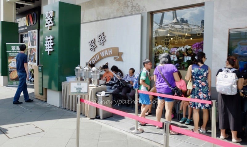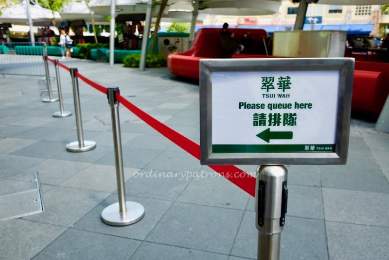 The management at Tsui Wah Clarke Quay had thoughtfully prepared containers of ice cold water for customers while they wait for their turn. When we returned at around 2.15 pm, the queue for indoor dining had shortened to less than 10 people, but it was a queue that never ends. People turn up and join in dribs and drabs. The outdoor area was open and tables were available without waiting. Our estimate was that the queue for an indoor table at lunch time weekday at Tsui Wah Singapore was around 30 minutes and around 15 minutes in the mid-afternoon after lunch.
