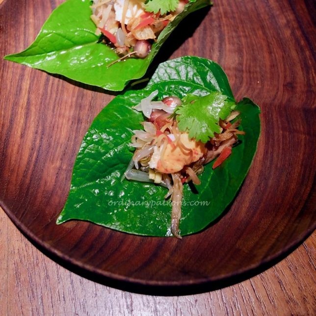 Miang of lobster, chicken, green mango, snake fruit, and herbs served on a betel leaf.