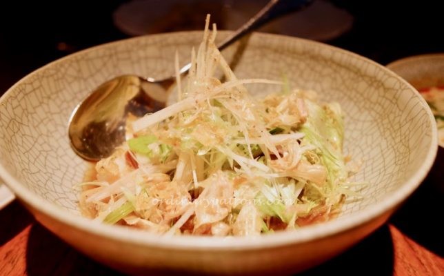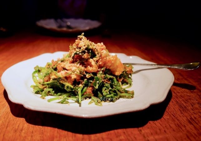 We had to choose one entrée from the menu. We decided to go with the “fiddlehead ferns from northern Thailand with songkla wild prawns and delicious tawai dressing” because we were curious about the fiddlehead fern. It turned out to be a crunchy type of vegetable served as a salad with a mildly spicy dressing.