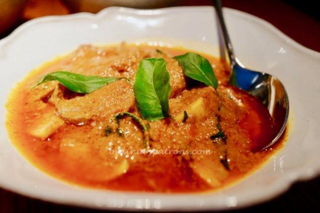 Rich red curry of duck with snake fruit , sour yellow eggplant and chilli leaves.