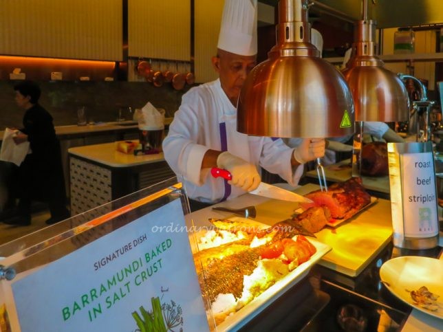The choice of main items at the lunch buffet of Rise Restaurant is extensive. There are roast beefs, pastas, dim sum, tandoori selection, mala dishes and a whole range of Singapore food. The Signature Barramundi Baked in Salt Crust is popular.