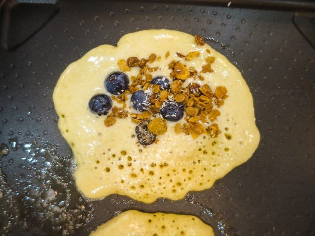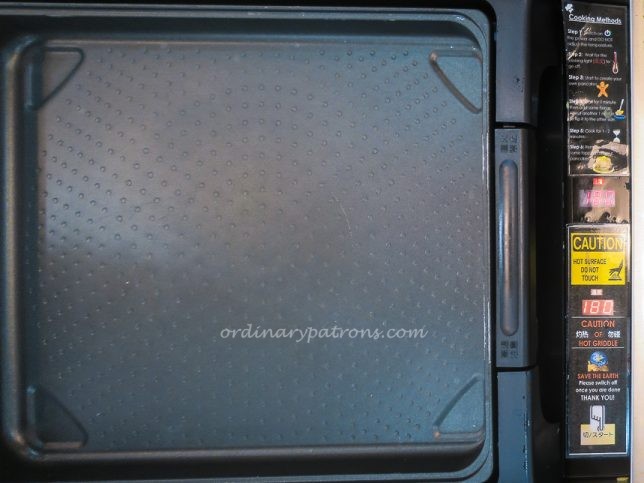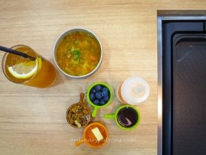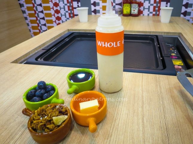 We decided to have a pancake making experience and selected the Whole Grain Batter ($8.50) and picked several toppings – Granola ($2), Lavender Homey ($3) and Blueberry ($3). The staff prepared the items ordered and brought them to the table. She then turned on the griddle. Cooking instructions were found on a sticker at the side of the griddle.