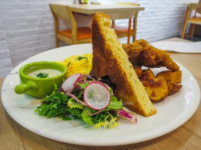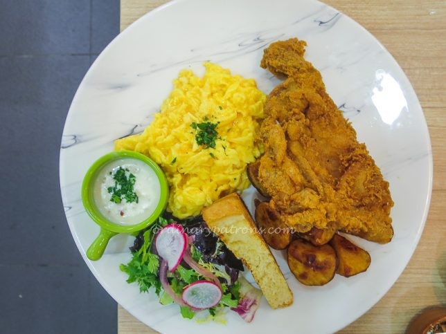 Slappy Cakes’ country fried chicken dish was quite a pleasant surprise. The chicken was served with scrambled eggs, salad, potatoes and toast. The portion was quite substantial. The scrambled eggs were fluffy and the fried chicken was delicious with a flavourful and crispy outside.