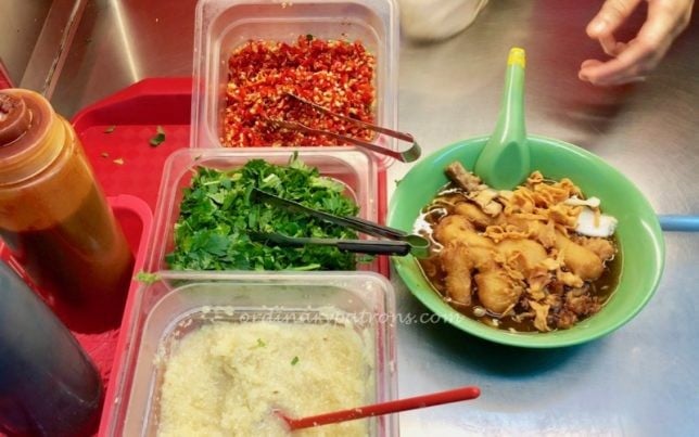Service was quick and we soon reached the head of the queue. Various condiments (chilli, garlic, vinegar etc) were available to be added to the customer’s taste. We added a bit of everything (picture below).