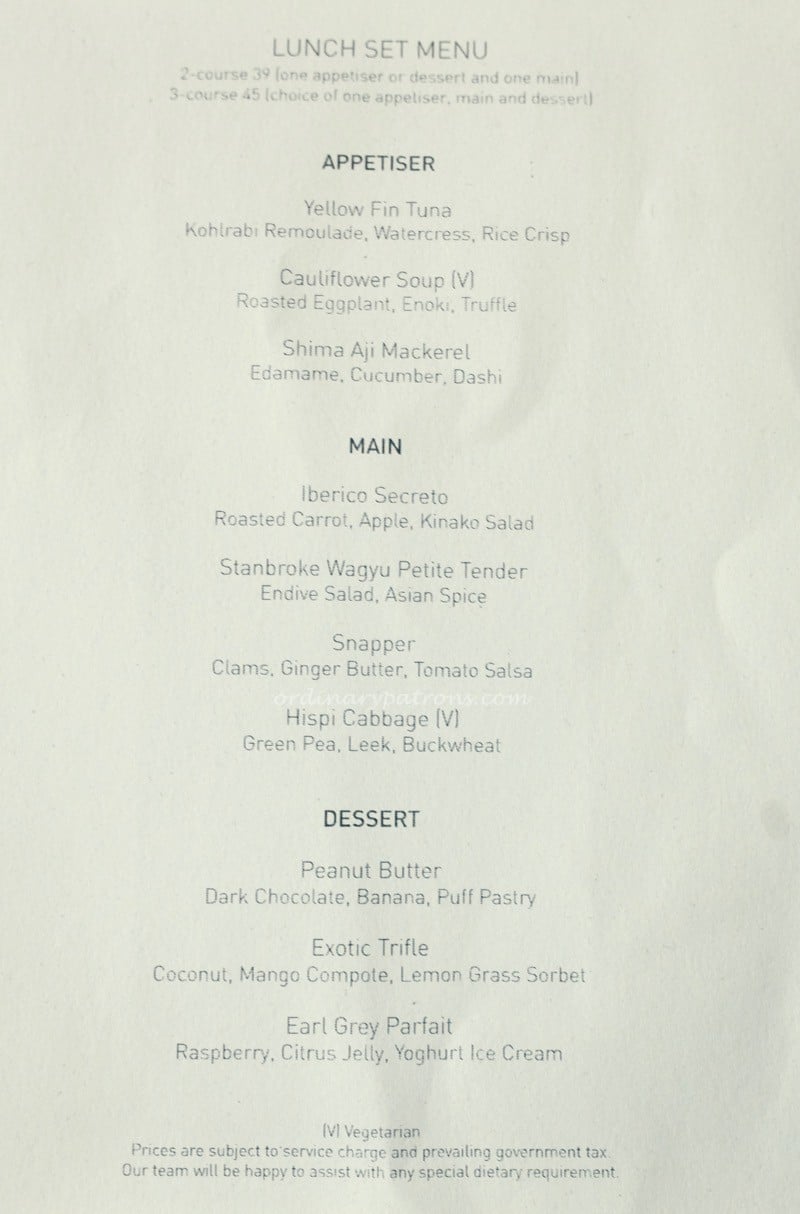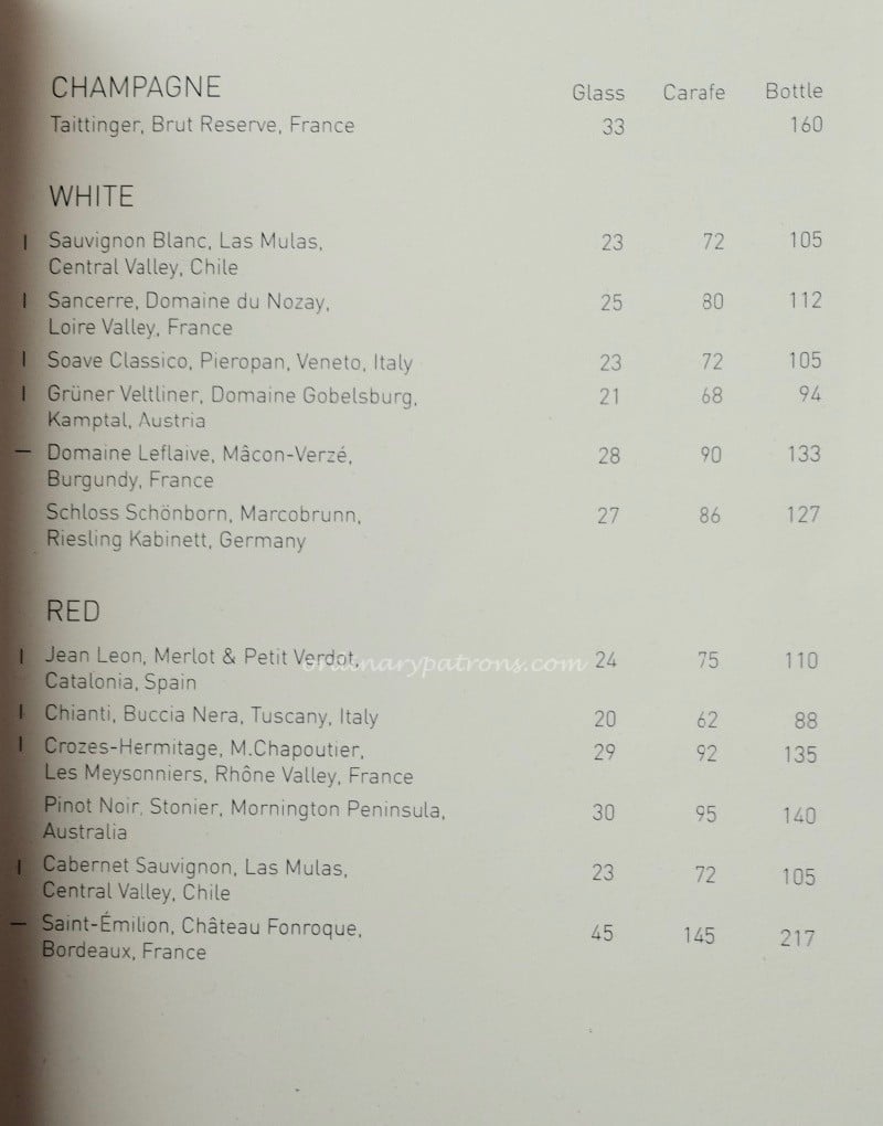At lunch time, there is a lunch set menu in addition to the ala carte menu. You can find both menus, with prices, on the SKAI website (link below). Here is a picture of the lunch menu and a page from the wine list. We selected the 3-course $45 menu and would recommend that our readers do likewise as the extra $6 will bring you more than the money’s worth of happiness. If the added calories are the obstacle, they can be walked off after lunch at the Raffles City mall downstairs.