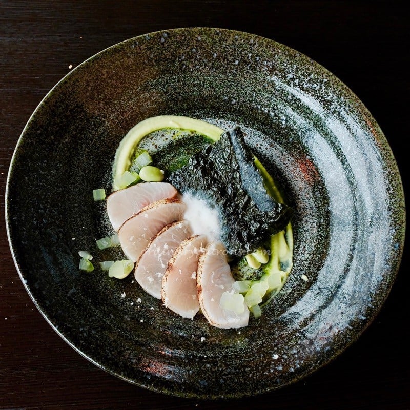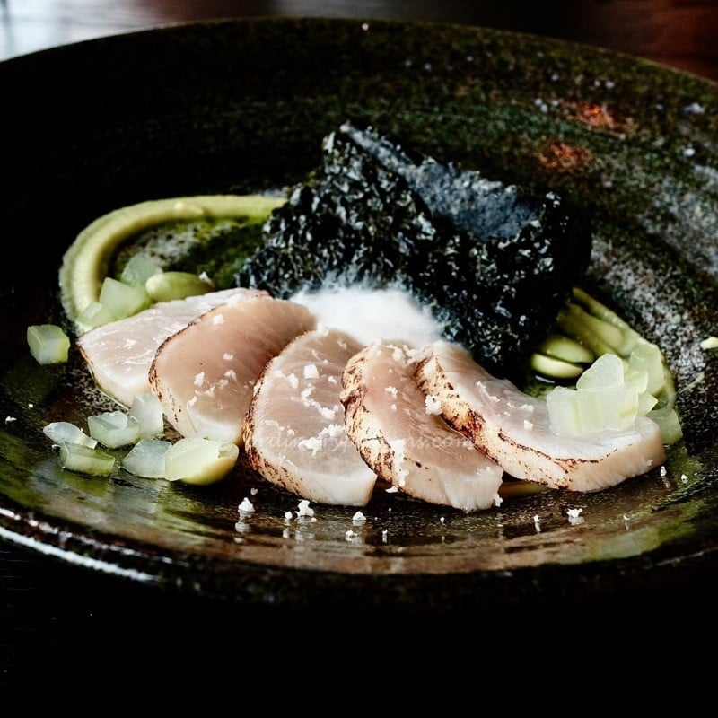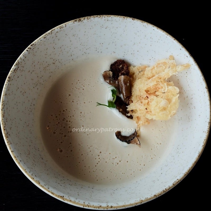 Our selected appetisers were the Shima Aji Mackerel and Cauiflower Soup. The mackerel was served raw but lightly seared at the edge. Mackerel has a stronger flavour than other fish used for sashimi. This one had a mild mackerel taste but with no ‘fishiness” and very good texture. The dashi sauce, crisp seaweed and other ingredients enhanced the natural taste.
