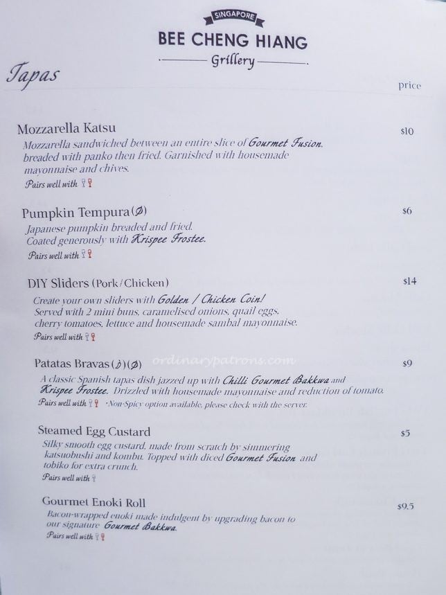 Bee Cheng Hiang Grillery currently only serves tapas, wine and beverages. A full menu of tapas, salad and mains will be launched later. Pictures of the current Tapas Menu, Beverage Menu and a random page of the Wine List are below.