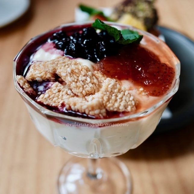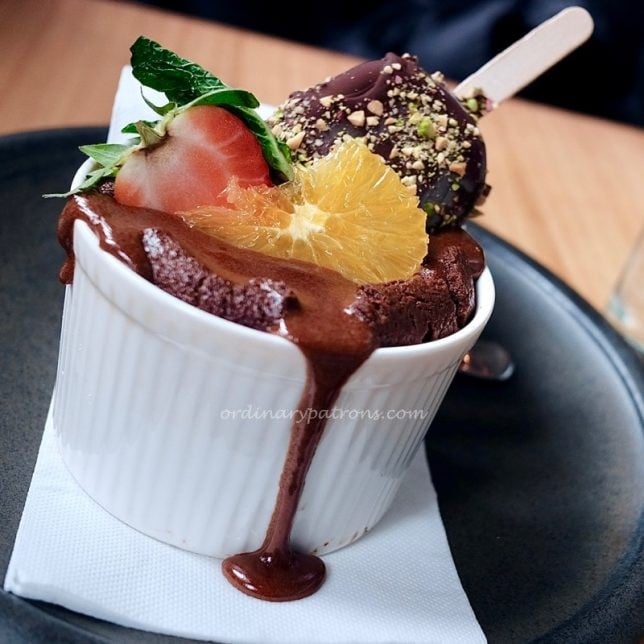 For desserts, we tried the yogurt mousse (above, A$10) and the chocolate lava shuffle (A$14). ย The latter was presented very beautifully. Both tasted great.