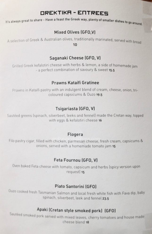 The Apaki (Cretan smoked pork A$18) was a dish we had not tried before. It is certainly one which we would want to eat again. The pork was tender and flavourful. Excellent!