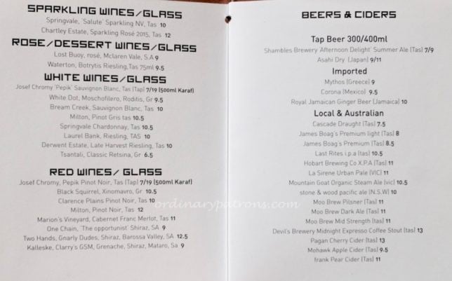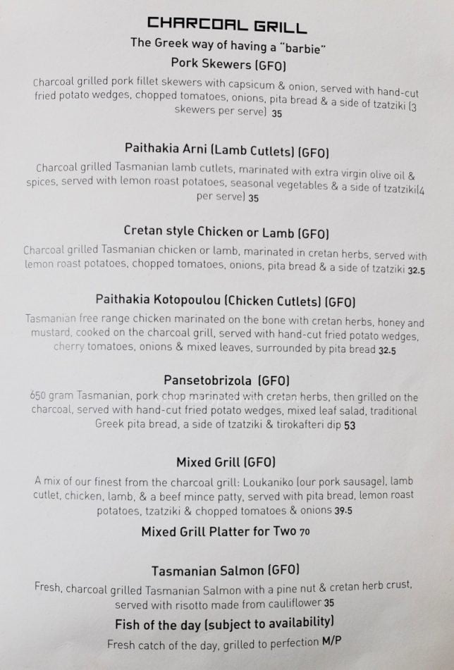 The Urban Greek Hobart Menu is comprehensive and contains the usual items we look for in Greek restaurants and more. Here are pictures of some pages from the drinks list and food menu.