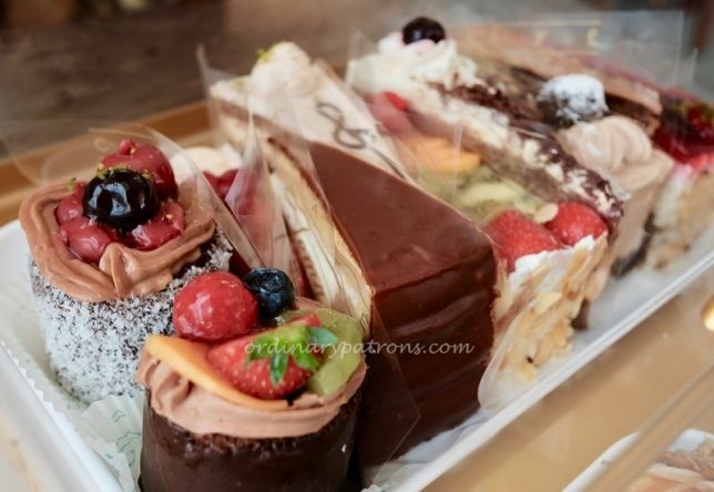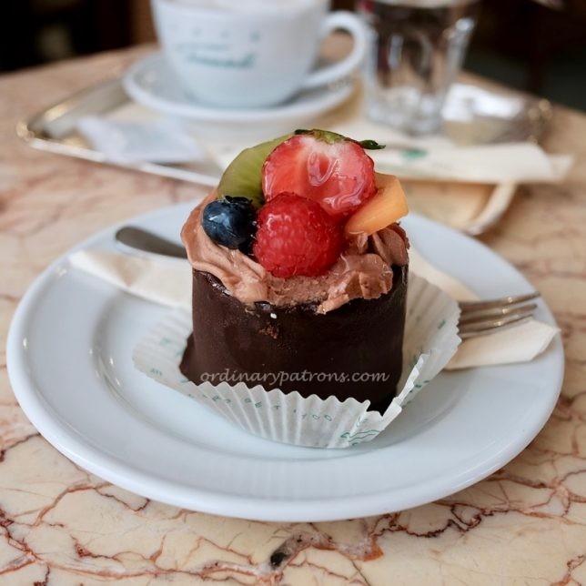 Our temptress arrived at our table soon after our coffee arrived. The selection of cakes on the tray was quite limited but there were enough to get us tempted. We selected the one that looked the most attractive. This beautiful piece of cake with fruit toppings cost 4.50 euros. A nice companion to go with the cappuccino (4.30 each) that we were having.