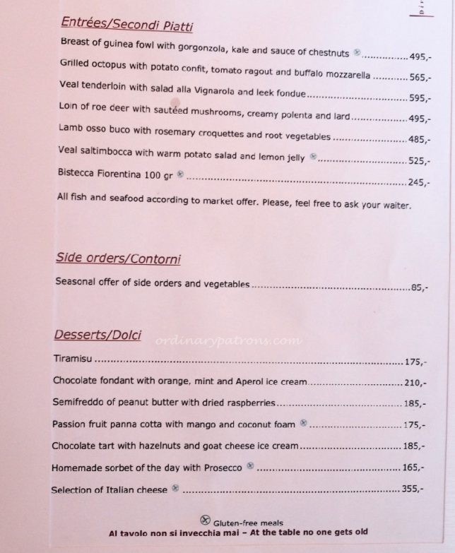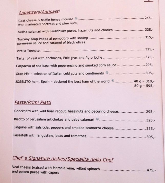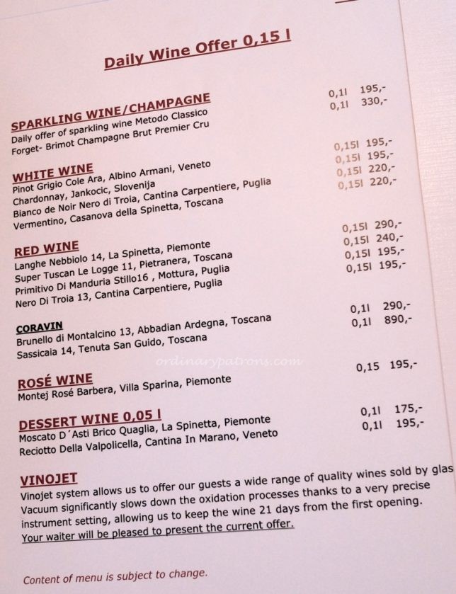 There are many Italian restaurants in Prague.  We picked Divinis because of its location near the Jewish Quarter and the nice photos of the restaurant on its website. It looked like a quiet homely restaurant.  It is listed as a Michelin Bib Gourmand restaurant. According to Michelin, “‘Bibs’ are awarded for simple yet skilful cooking for under £28 or €40″.  In other words, a good and affordable restaurant in Prague.