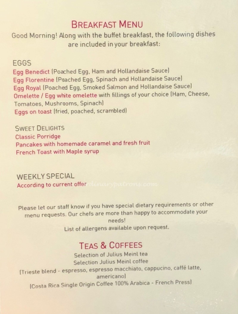 Hotel Josef Breakfast Menu