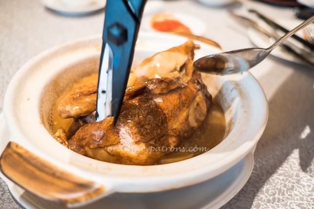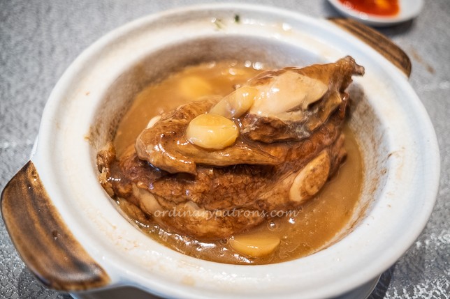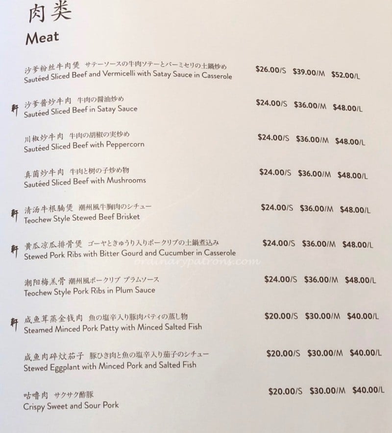 The two items that we tried from the a la carte menu were the pan-fried seafood and yam pancake (picture above, $24) and the roasted chicken served with yellow beans and water chestnuts ($20 for half chicken). The pancakes were bland and dry. We liked the chicken more. It was cooked till the meat fell off the bones easily and the gravy was tasty. Fortunately, the two dishes can be combined.ย The gravy from the chicken rescued the pancakes.