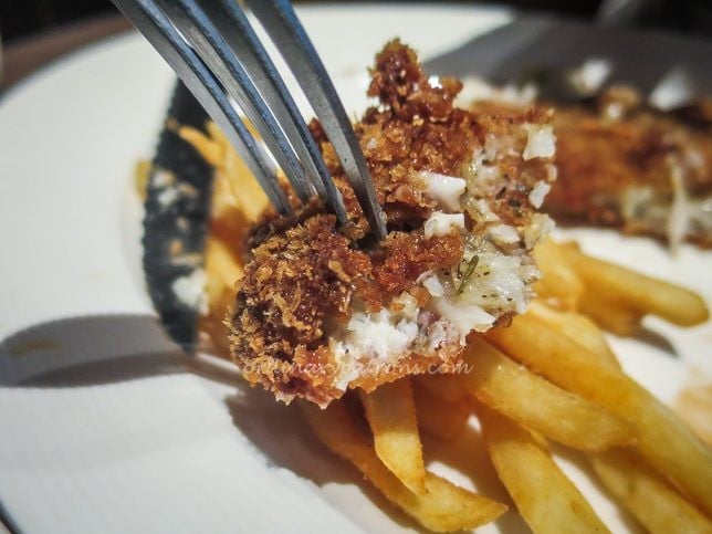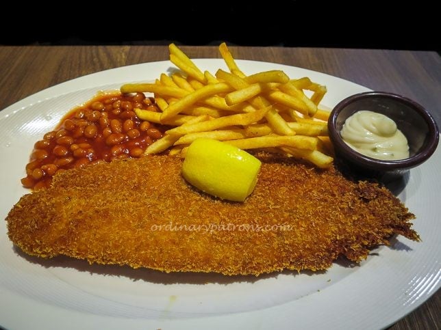 The plate of fish and chips with BBQ beans looked quite plain and ordinary. The only remarkable thing was that the piece of fish was large. The breaded fish fillet was served with a wedge of lemon and tartar sauce. It was well cooked and had a nice crispy outer layer. Tastewise, it was about what you would expect at that price point – not gourmet stuff but good enough.