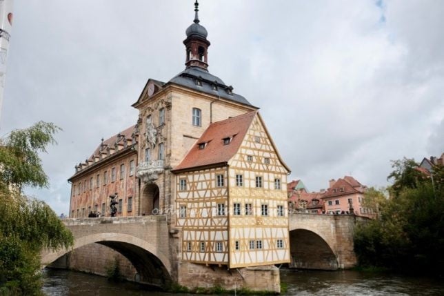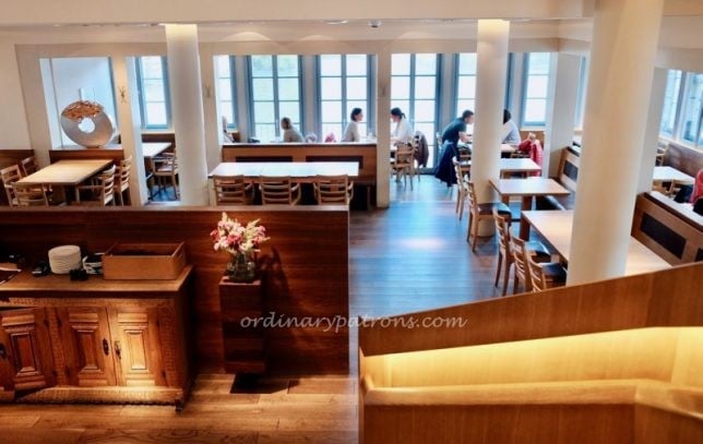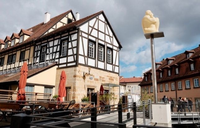 Bamberg is a river town. Part of its charm lies in the way the river weaves its way into the town. Some old buildings are built right to the edge of the water. The Eckerts restaurant is located in one such building. Their website describes it as follows: “Our restaurant Eckerts is anchored like a ship in the middle of the river Regnitz”. Part of the building looks old but there are some modern features like the sculpture out in front and its interior.
