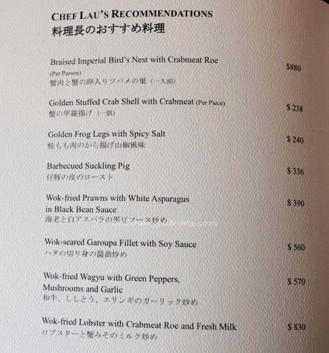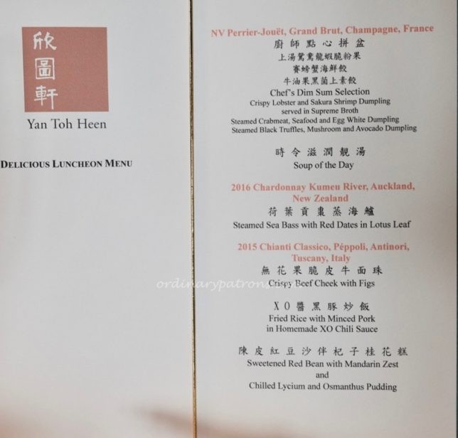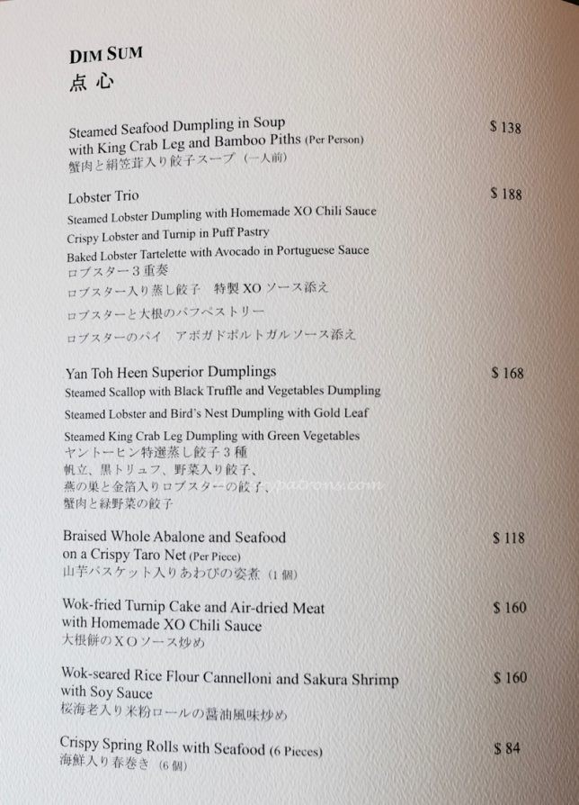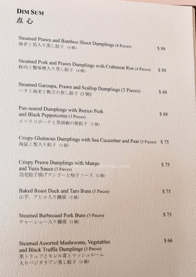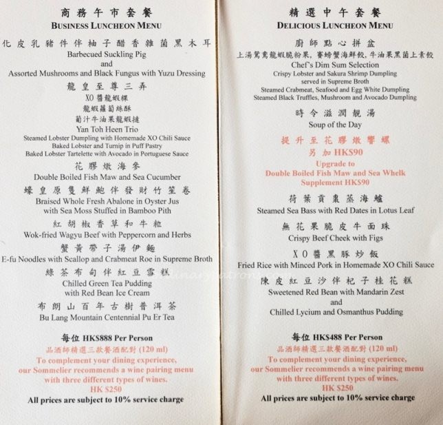 There is a comprehensive menu at Yan Toh Heen. Dim dum is served during lunch. There were also two set lunch menus – the Business Luncheon (HK$888) and the Delicious Luncheon (HK$488). We selected the latter and also opted for the wine pairing (HK$250). Here are some sample pages from the Yan Toh Heen Menu.