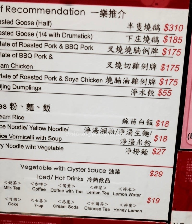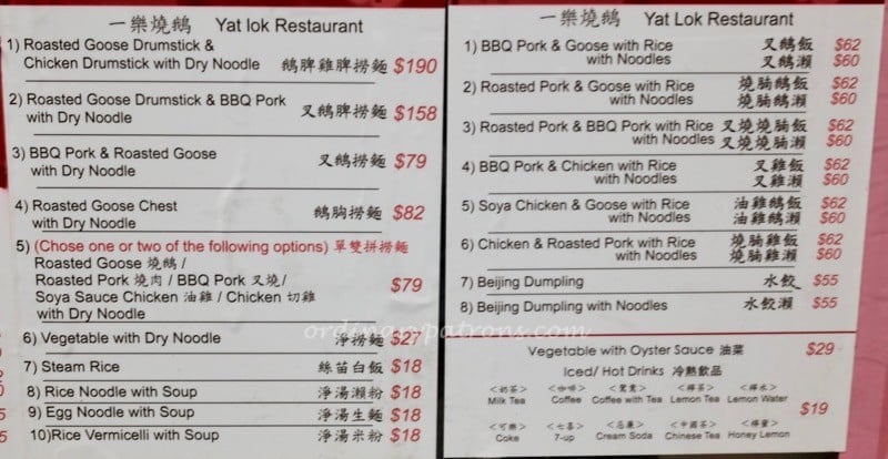 Yat Lok Roast Goose HK Menu