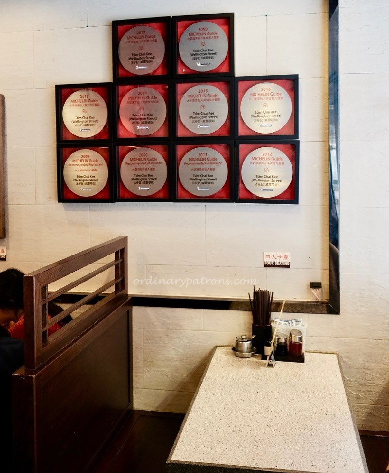 Tsim Chai Kee is located on Wellington Street in Central Hong Kong. Mak’s Noodles is just across the road. We were there early in the morning and there was no queue. The restaurant space is small but clean. There are a few long tables and some booth seats. Be prepared to sit anywhere and with anyone. The plaques on the wall show off the awards that Tsim Chai Kee has received over the years including the Michelin Bib Gourmand award which they have been receiving since 2012.