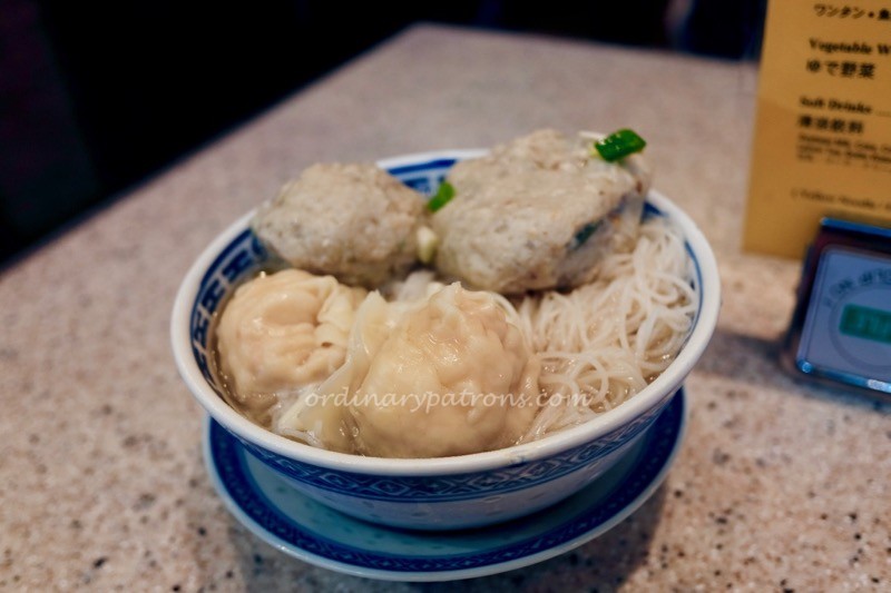 Being unfamiliar with the food at Tsim Chai Kee, we ordered two bowls with different permutations. Noodles with all three toppings (HK$42) and rice noodles with fish ball and wanton (HK$38). It dawned on us that we had severely over-ordered when the food arrived. The portions were huge. The wantons and the fish balls were the size of squash balls. They were generous with the noodles as well.