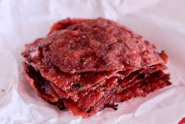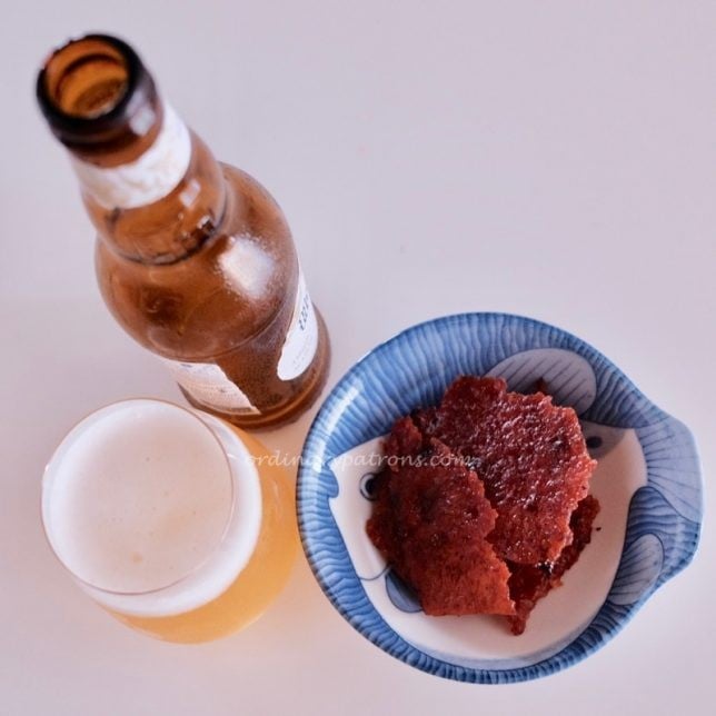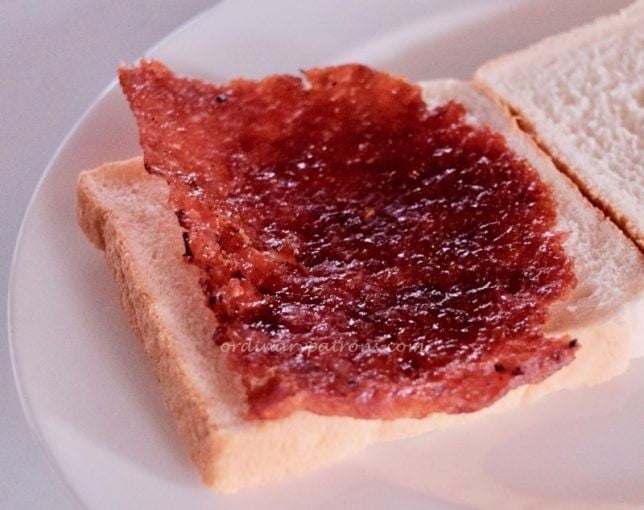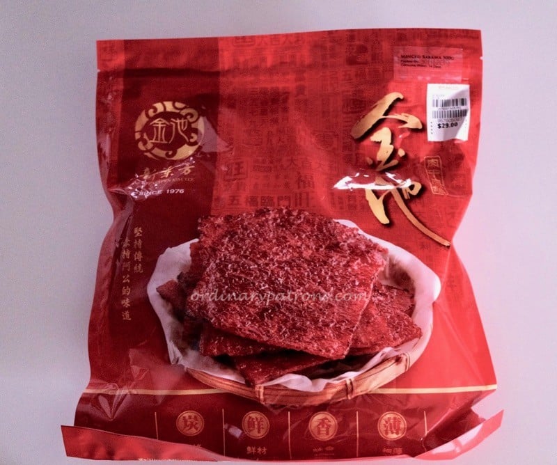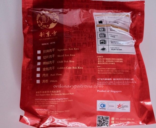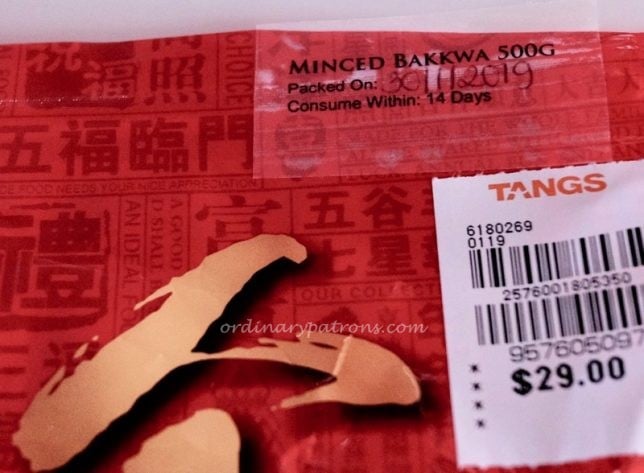 We only realised that we had purchased the minced meat version when we got home. The sticker with the description was small and faint. The bak kwa had been made the day before and has to be consumed within 14 days. Which was not a problem as it won’t survive beyond a few days. Sliced pork bak kwa was the type that was used in the 8 Days review, so what we bought was slightly different. Sliced pork has a better texture but can be sometimes too hard. We are fine with either version. The Kim Tee bak kwa (minced pork version) looked normal and did not appear overly red or puffy (as pointed out in the article). Each 500g pack contains about 12 slices. They look regular shaped and consistent.