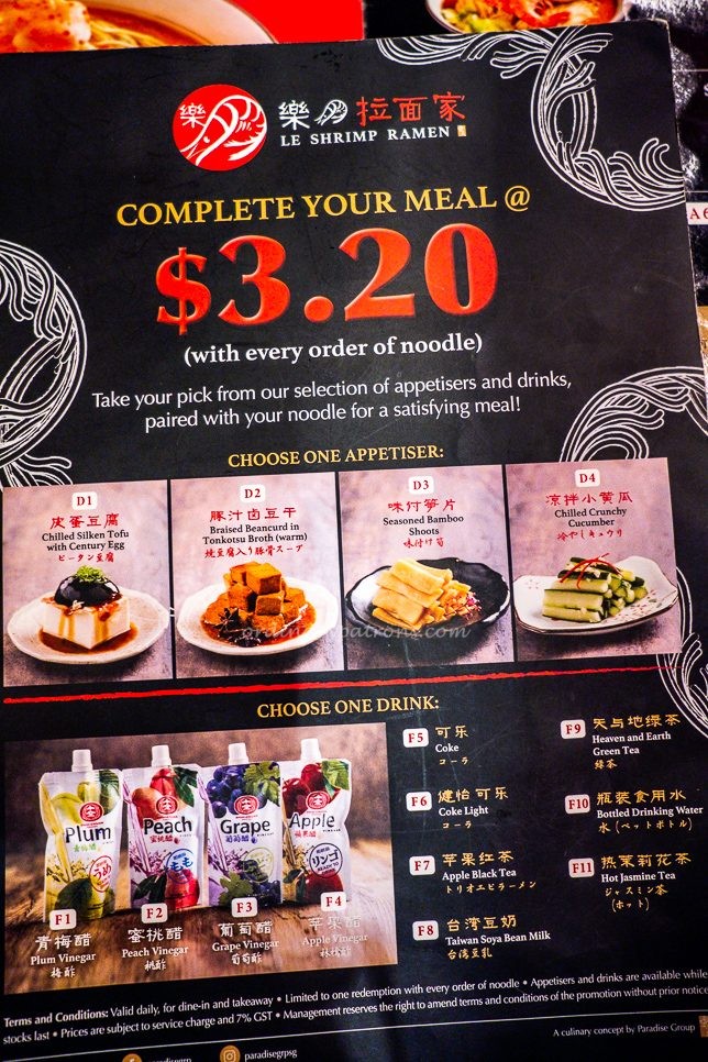 Le Shrimp Ramen Paragon is a new restaurant by the Paradise Group that opened at the basement of the Paragon Orchard shopping mall recently. It is a new brand within the group and this is the first Le Shrimp Ramen to open in Singapore. Another one is said to be opening soon at Vivo City. According to their website, it is ” (i)nspired by the flavours of Japanese ramen broth and silky threads of Chinese la mian, Le Shrimp Ramen is a perfect marriage of Chinese and Japanese culture, offering a simple menu of elaborate flavours”.