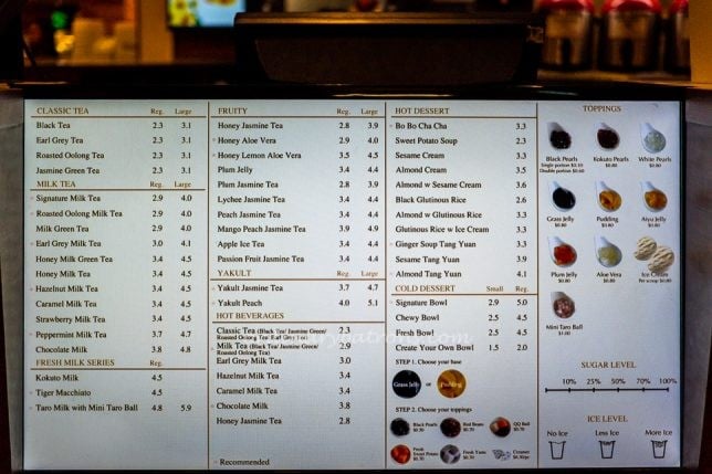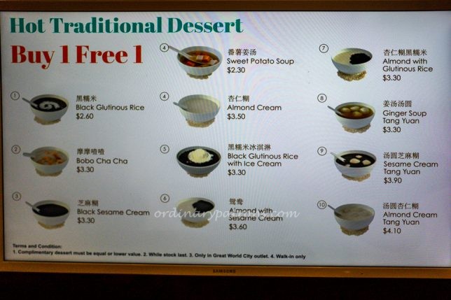 For a small kiosk, the two ladies manning the place at Tea Tree Cafe sure can prepare a lot of different drinks and desserts. As their name suggests, there is a wide range of teas – classic teas, milk teas, fruity teas etc. In addition, there is a range of hot traditional desserts – sweet potato soup, black glutinous rice, almond cream etc. They are priced from $2.30 to $4. With the 1 for 1 offer, you can see why we were tempted.