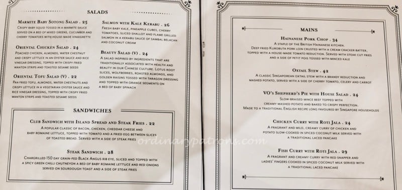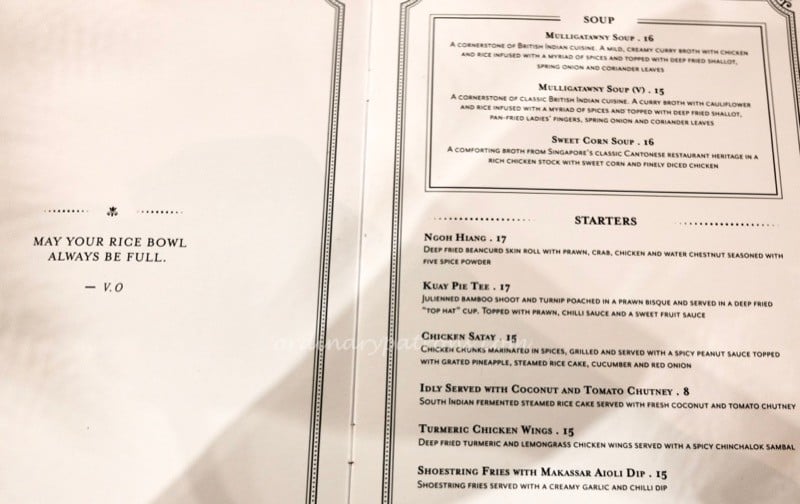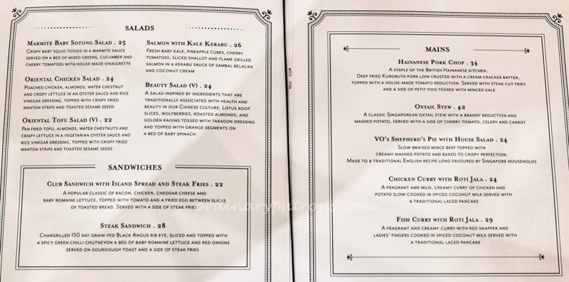 Here are pictures of some pages of the Violet Oon Singapore Ion Orchard menu. We like the quote from the chef. The menu contains more than just Peranakan cuisine. Examples of other dishes are local favourites such as chicken rice and Hainanese pork chop and British fare like shepherd’s pie and Mulligatawny soup. Nyonya food takes up one page of the menu. Being creatures of habit, we still think of VO as the dame of Peranakan cuisine in Singapore and most of our selections came from that page.
