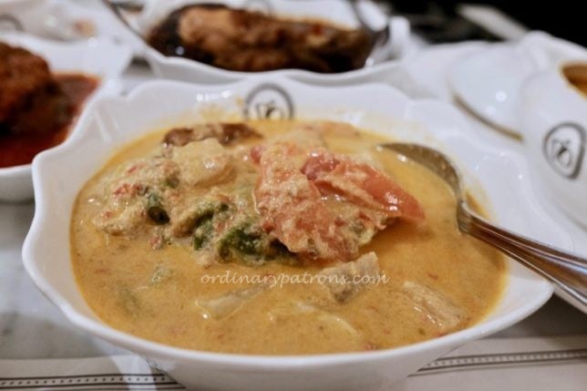 We had three Nyonya dishes to eat with steamed rice. The ayam buah keluak ($23, above picture) was average. There were three buah keluak shells stuffed with the precious nut. But the cooking did not bring out their presence and the anticipated rich nutty taste was hardly present. It was like a dish of braised chicken.