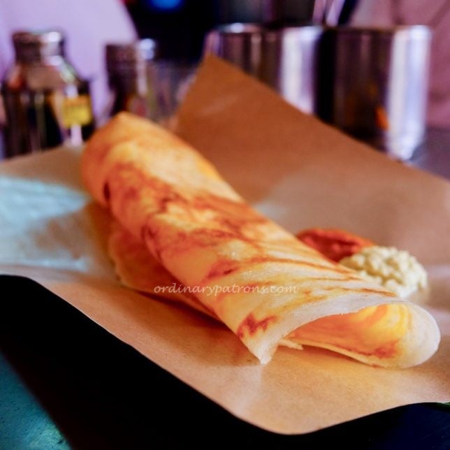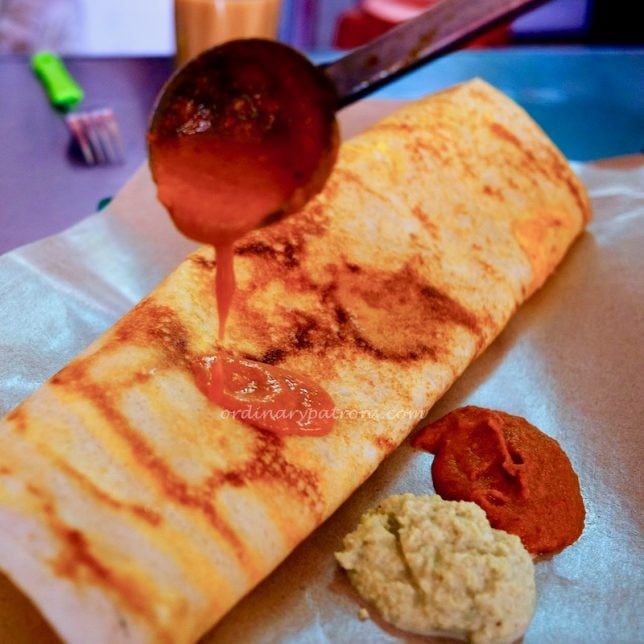 The paper dosai is large like a vinyl record but thin and almost weightless. Best eaten with the sauces and gravy provided.