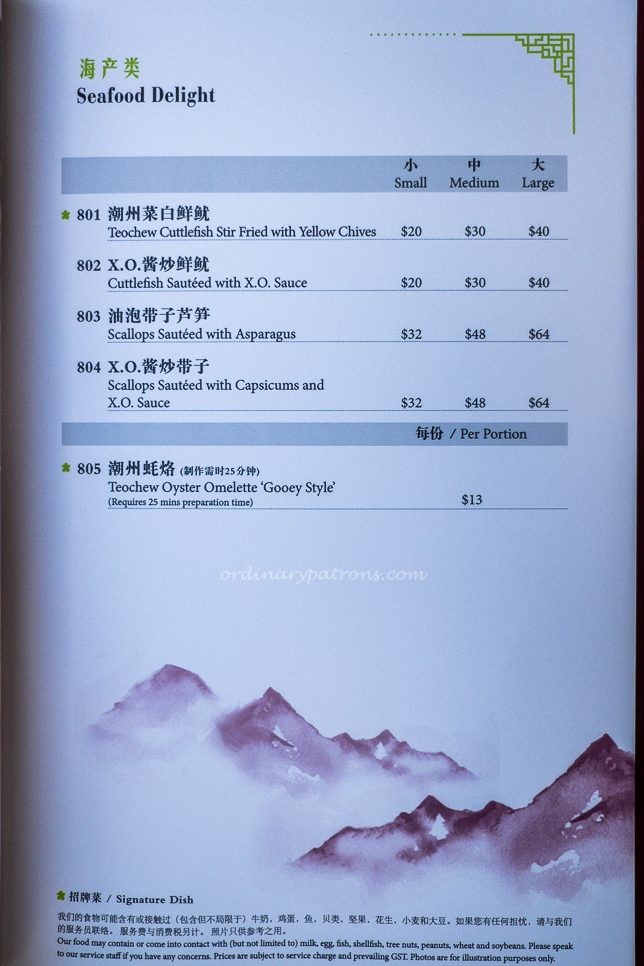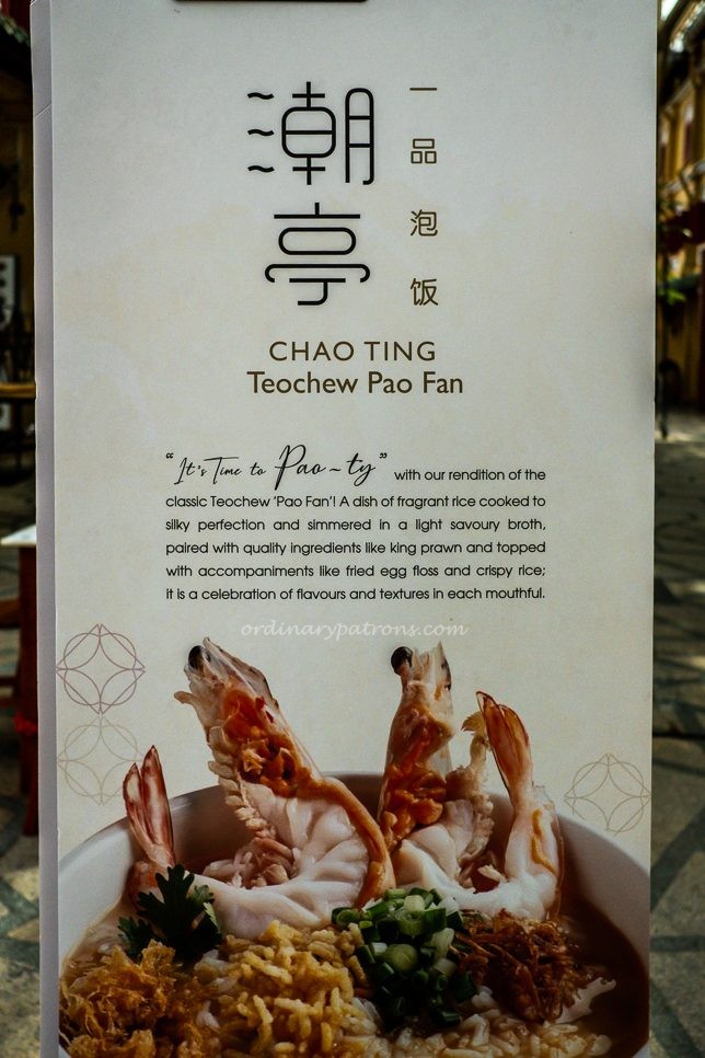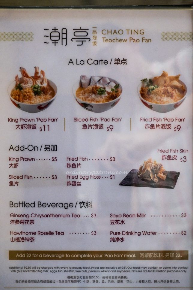 Right next door to Zui Yu Xuan is Chao Ting ๆฝฎไบญ at Far East Square. Also opened by the Jumbo Group, this small eatery serves quick casual Teochew fare for the busy people working around Raffles Place and Shenton Way. They specialise in “Pao Fan” – rice in seafood broth. Here is a picture of the Chao Ting ๆฝฎไบญ menu.