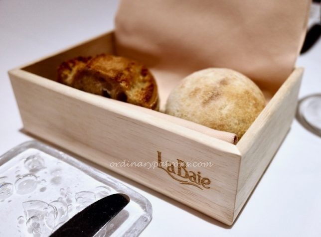 Lunch at La Baie was an elegant affair. Everyone spoke in hushed tones. The table linen was thick and crisp and service was top notch. Even the bread was served in personal wooden boxes. Two types of butter and salt were provided. The bread alone gave us quite a bit of happiness.