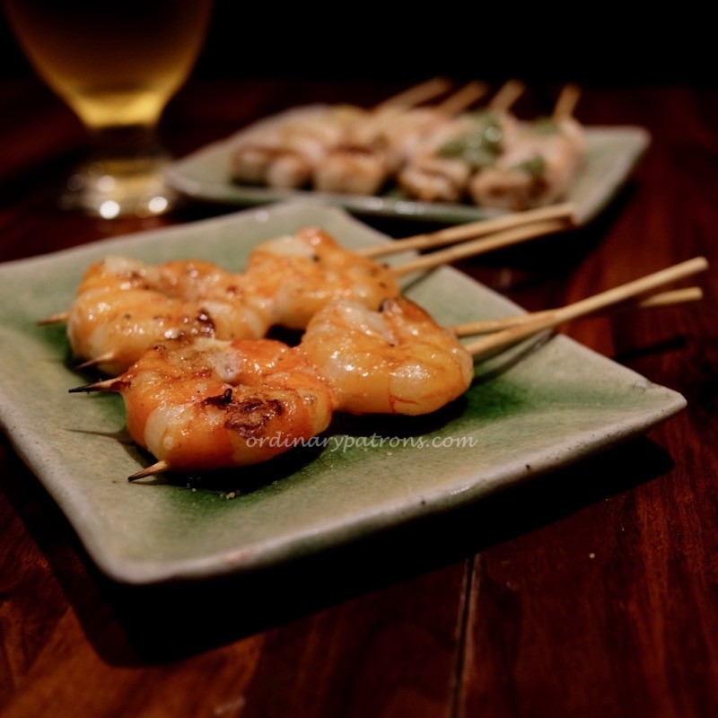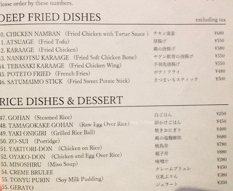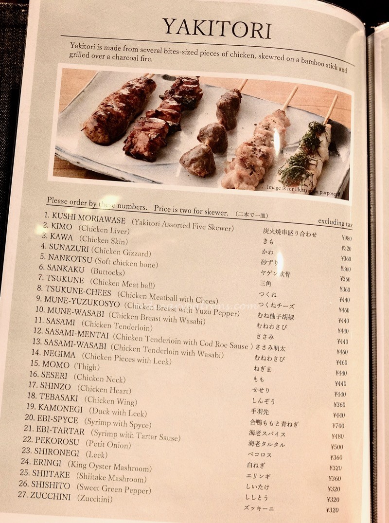 Gonbei serves a wide range of yakitori – grilled skewers of different chicken parts as well as some prawns and vegetables. Here are pictures of some pages from the English menu. There seemed to be more specials on the loose leaf Japanese menu, which alas, we could not comprehend.